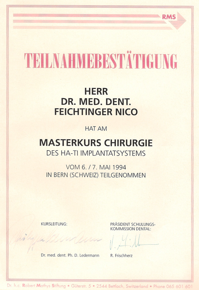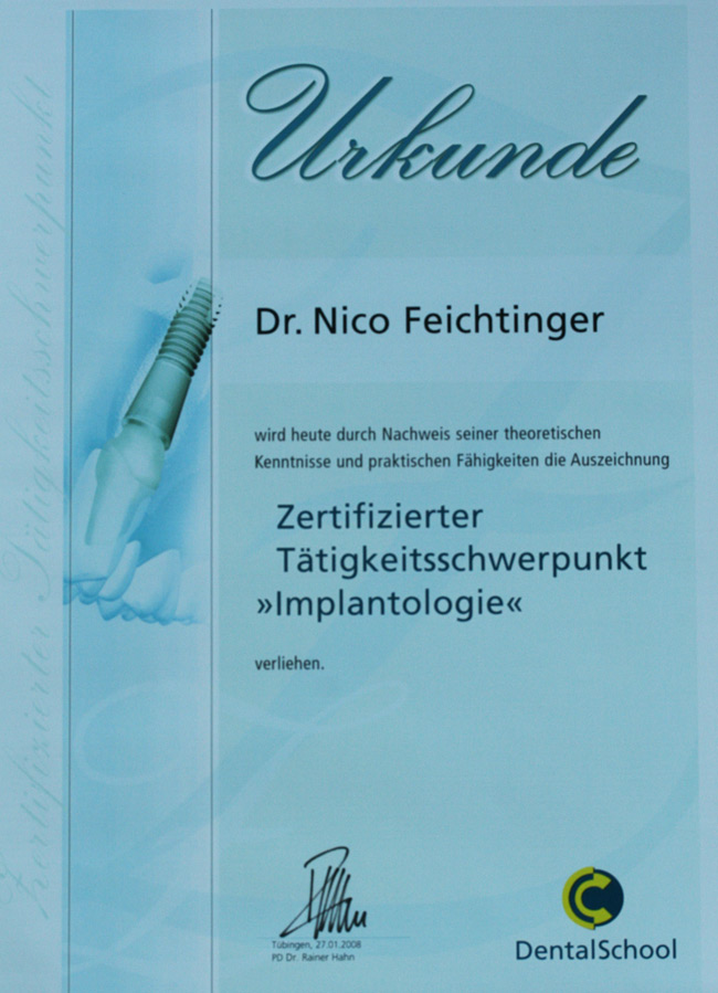 Profitieren sie von meiner über 25-jährigen Implantaterfahrung und den kontinuierlichen Fortbildungen auf diesem Gebiet (z. B. Masterkurs Chirurgie Prof. Ledermann Bern/ Zertifizierung Dentalschool Tübingen Prof. Hahn etc.). Ob Sie ein einzelnes Implantat benötigen, um die substanzraubende Präparation der Nachbarzähne für eine konventionelle Brücke zu vermeiden oder ob Sie eine festsitzende Lösung zum Ersatz aller Zähne benötigen, wir werden immer eine maßgeschneiderte Lösung für Sie finden. Wir verfügen über die neueste 3-D Planungssoftware, die mit höchster Sicherheit und mittels schienengeführter Chirurgie extrem sanft zur gewünschten Implantation führt (
