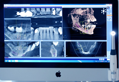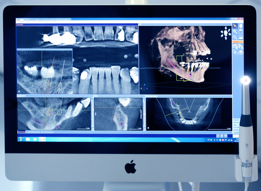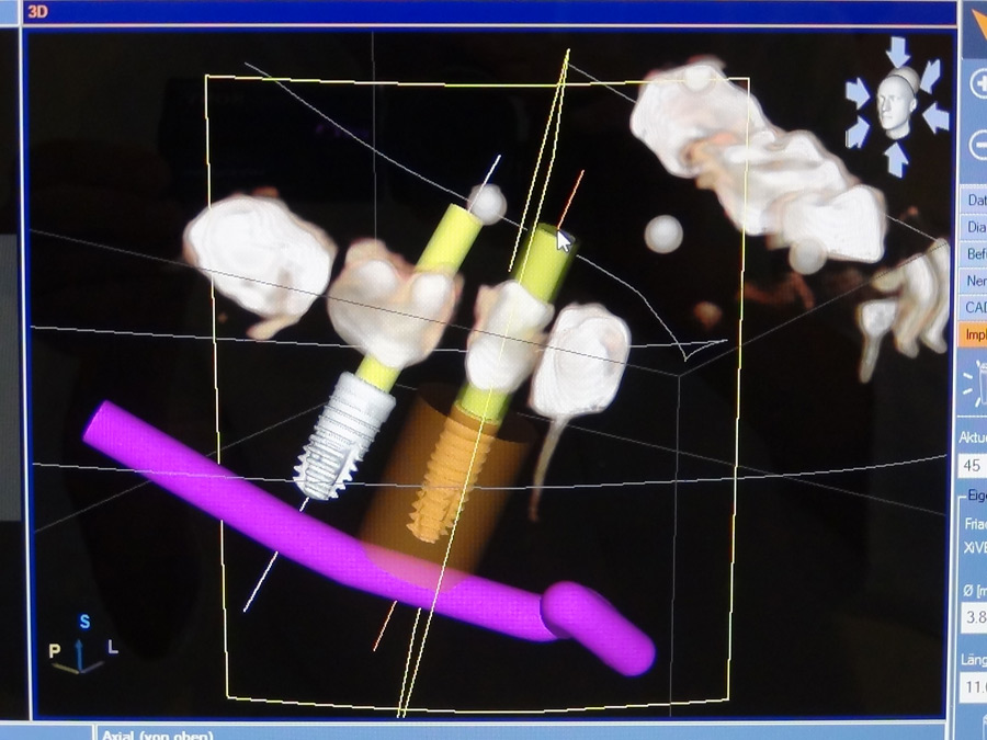 Das ermöglicht in Kombination mit unserer SICAT Software eine präzise Voraussage der zu erwartenden Operationsbedingungen. Abstände zu allen empfindlichen Nachbarstrukturen wie Nerven, Mundboden, Kieferhöhle und besonderen Knochenmerkmalen sind damit exakt dreidimensional messbar. In einer Datenbank sind tausende international erhältliche Implantattypen vorhanden. Wir können die Implantation perfekt virtuell planen und den exakt am besten passenden Typ vorab in jeder Richtung im Computermodell Ihres Kiefers ausprobieren. Dabei schützt uns die Software nicht nur vor den bereits beschrieben chirurgisch unerwarteten Komplikationen.