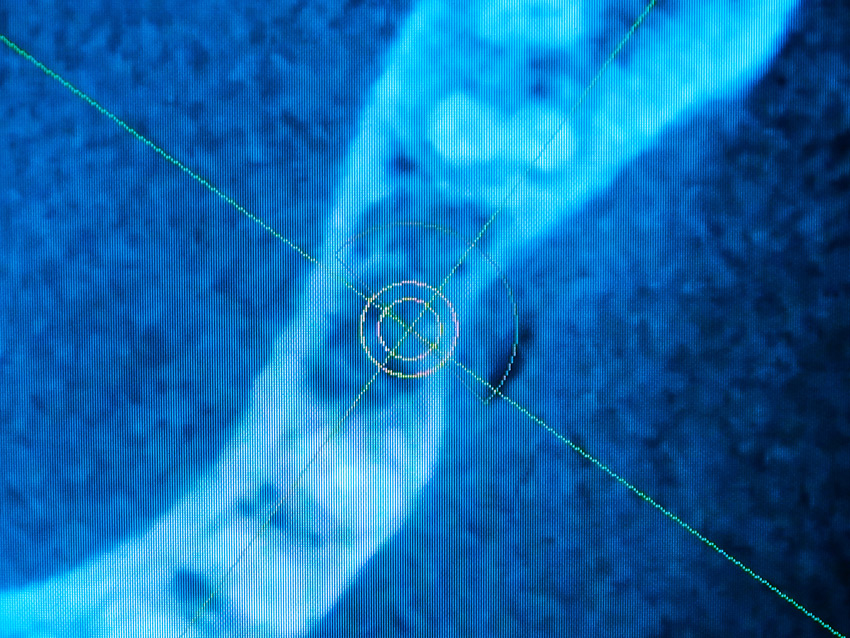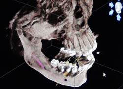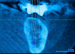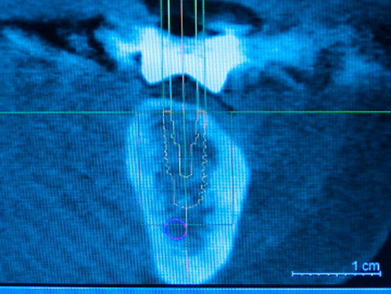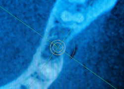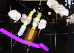 Implantate sind aus der heutigen Zahnmedizin nicht mehr wegzudenken. Dabei wird eine künstliche Zahnwurzel (aus Titan oder Keramik) in Form einer Schraube im Kiefer verankert. Der absolut schmerzfreien Bohrung geht natürlich eine ausführliche Diagnostik voraus, denn es gilt Nervensträngen, Kiefer- oder Nasennebenhöhlen sowie eventuell stark ausladenden Wurzeln von Nachbarzähnen auszuweichen. Die übliche Basis einer jeden Implantation vorausgehenden Machbarkeitsstudie ist dabei die zweidimensionale Röntgenaufnahme, insbesondere das sogenannte Orthopantomogramm (OPG). Indem man Schablonen in bekannter Größe mitröntgt, wird es per Dreisatzrechnung möglich, zumindest zweidimensional das Platzangebot für ein Implantat auszurechnen.