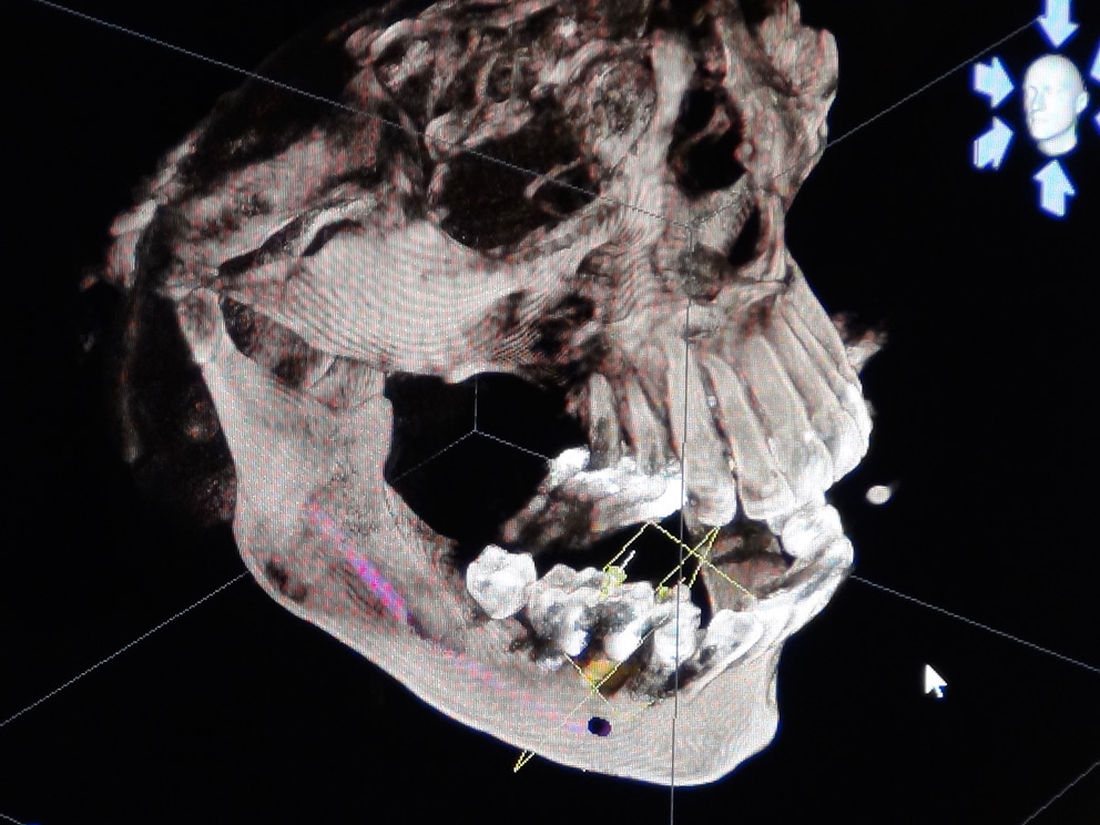 Die Kieferbreite kann dabei nur geschätzt werden. Das führt dazu, dass man das Zahnfleisch immer vom Kiefer wegklappen muss, um zu sehen welche Breite und Form der Knochen hat. Dabei sind Überraschungen an der Tagesordnung. Ein Kieferkamm von z. B. 6 mm Breite besteht manchmal nur aus Bindegewebe und nach der obligatorischen Öffnung bleibt ein fast messerscharfer Grat, an dem ohne vorherigen Knochenaufbau keine Implantation durchgeführt werden kann. Manchmal ist der Kieferkamm zwar auch hoch, es zeigt sich aber nach Öffnung des Zahnfleisches, dass er stark gebogen ist und das ursprünglich vorgesehene Implantat zu dick ist und daher seitlich aus der Rundung rausschauen würde. In den 25 Jahren meiner implantologischen Tätigkeit habe ich daher schon manche Überraschung während der Operation erlebt, auf die ich mich gerne vorbereitet hätte. Das ist jetzt möglich geworden. In den letzten 2 Jahren ist die Auflösung von CT- sowie sogenannten DVT Aufnahmen deutlich verbessert worden. Eine Planung in 3D wird möglich, der gläserne Mensch zumindest im Kieferbereich Realität.