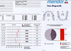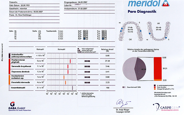 Zum Einen löst sich unbemerkt, schleichend der Knochen um die Zähne auf. Die Zähne werden locker und fallen aus. Zum Anderen gelangen ständig Bakterien und deren Zellgifte in das Körperinnere. Von internistischer Seite werden daher Zusammenhänge mit chronischen Erkrankungen wie Diabetes, Rheuma, Schlaganfällen bis hin zum Herzinfarkt vermutet. Betroffen von Parodontitis sind in Deutschland 82% der Bevölkerung über 35 Jahre (WHO). Behandelt werden aber nach Statistik der Krankenkassen nicht mal 5%. Unverständlich, denn die Behandlung ist heute im Gegensatz zu früher einfach, schnell und nahezu schmerzfrei. Sie stellt das Fundament für kosmetische und prothetische Verbesserungen dar. Was nützt die perfekteste Füllung, Krone, oder Laminate, wenn der Zahn mittelfristig rausfällt?